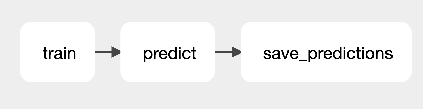 Figure 3: In this second consumer DAG, the feature-engineered dataset generated by the producer DAG is used to train a model. The predict task then uses that model to generate predictions, which are saved in the final save_predictions