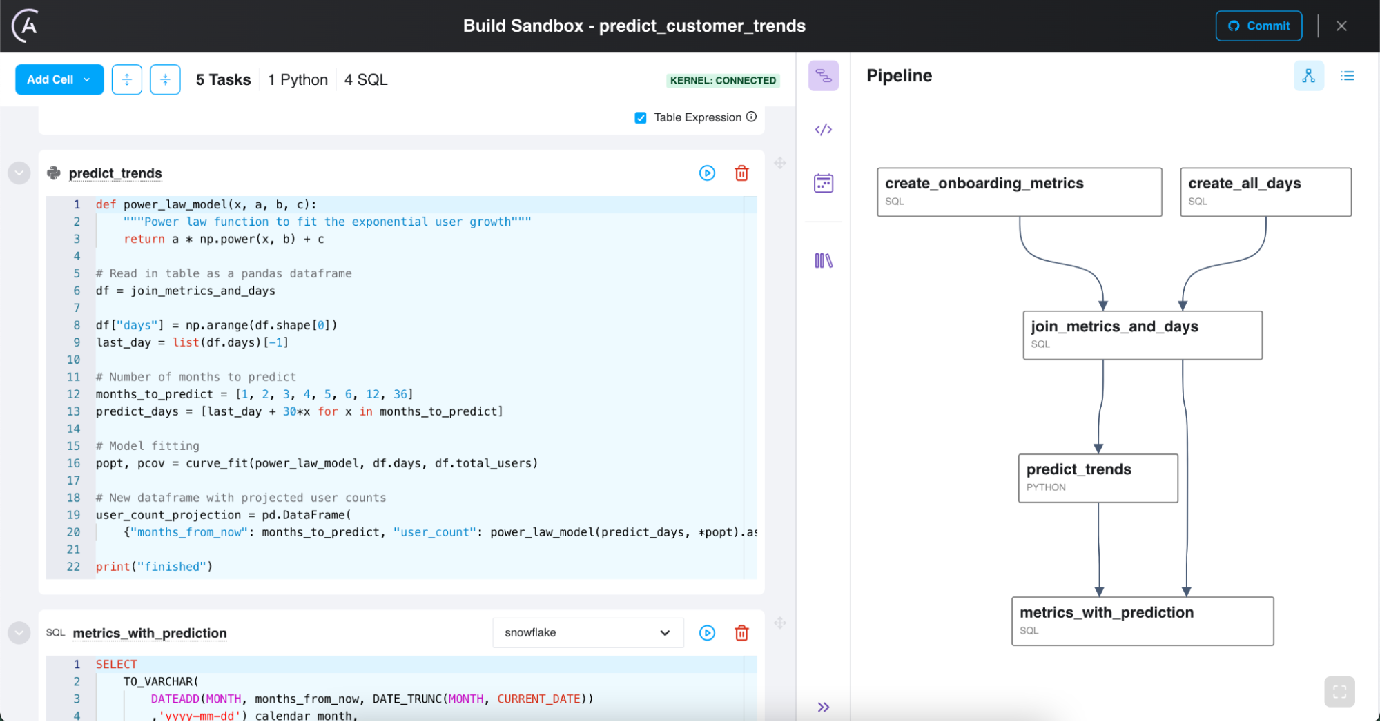 Figure 2: In this notebook-style interface for building data pipelines, a data practitioner outside of the core data team can create cells of Python and SQL code, which the notebook compiles into a DAG behind the scenes.