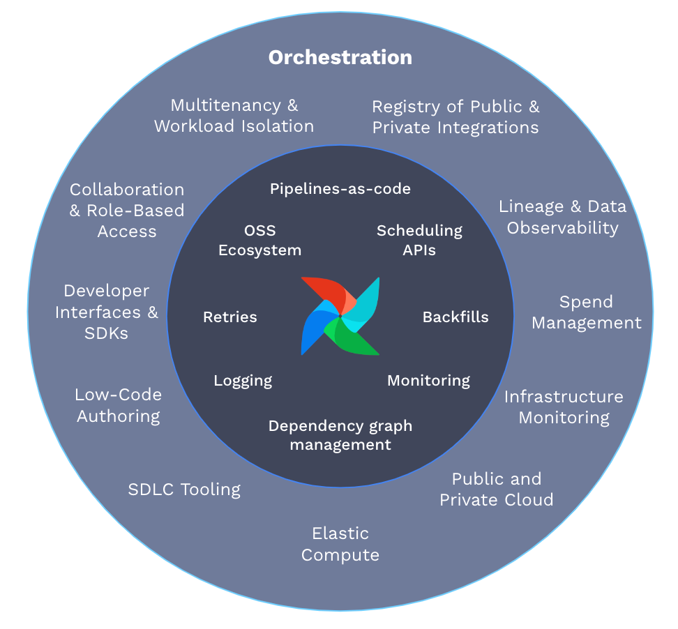 Airflow at the center, because you can’t manage a data ecosystem, you can’t do orchestration, without controlling the execution of the data pipelines. That’s why the key ingredient is a mature, popular, full-featured job scheduler and workflow manager — and why we’re deeply invested in open-source Airflow’s future.