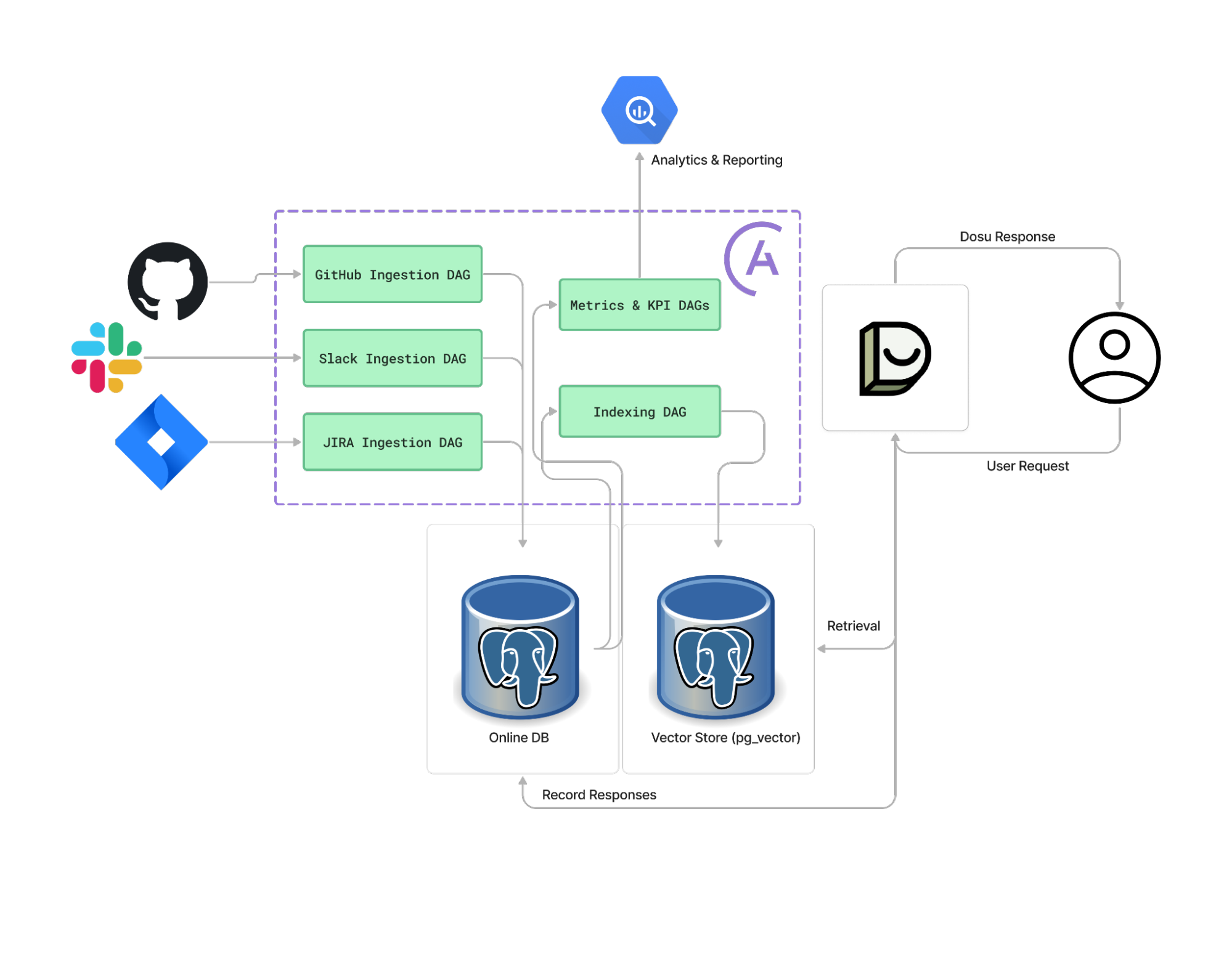 When Dosu handles a user query, it retrieves relevant contextual information from the vector store and processes that information through its reasoning engine to give a response. These responses are written back to the database where another set of DAGs uses them to generate metrics and KPIs.