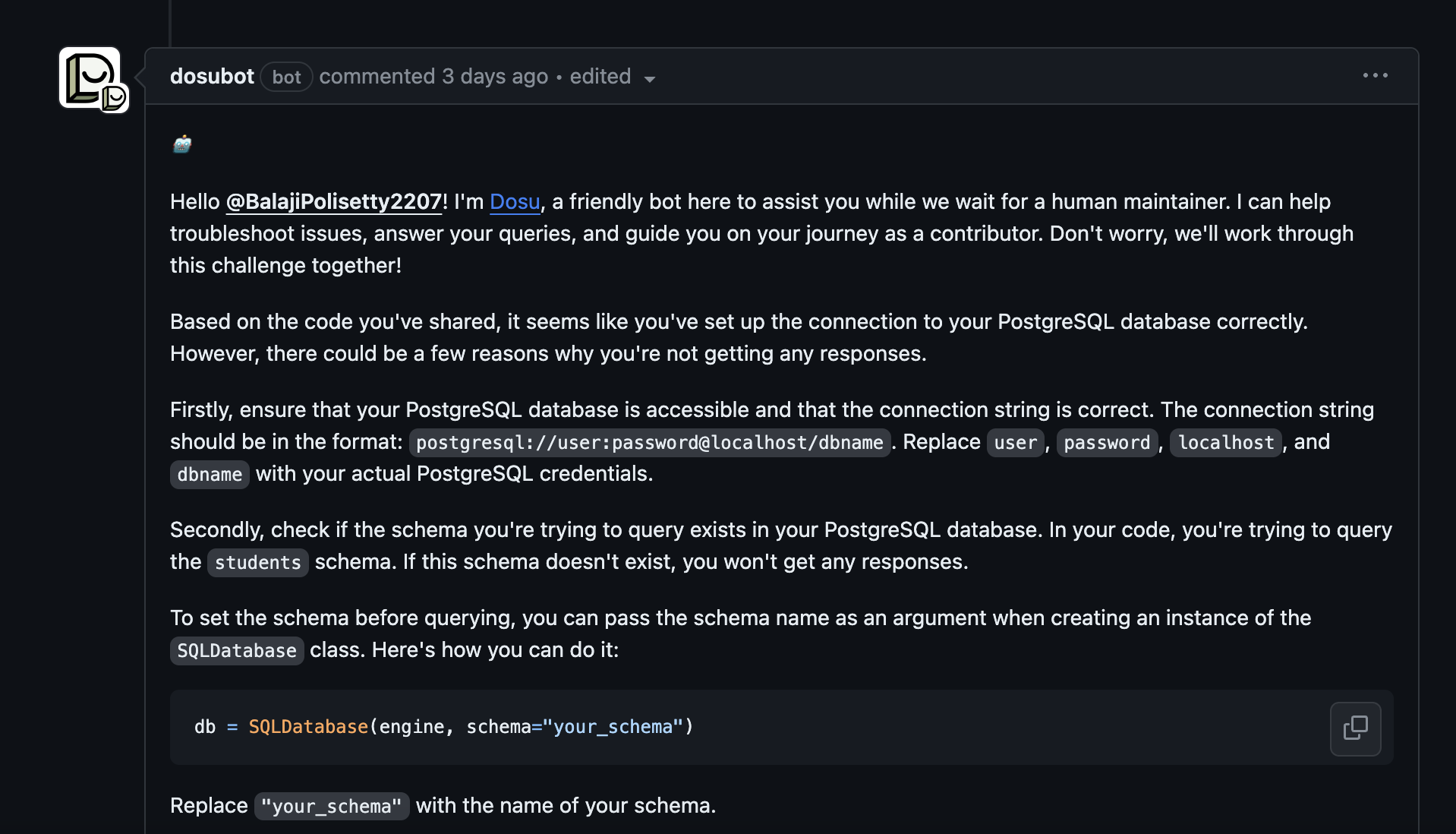 “Given that Cosmos came from a hackathon, from day one we weren’t staffed to fully support it. Issues were being raised, PRs were being contributed, and it was tough to keep up. Dosu has been helpful in the triaging process as it allows us to give contributors and community members an instant response.”