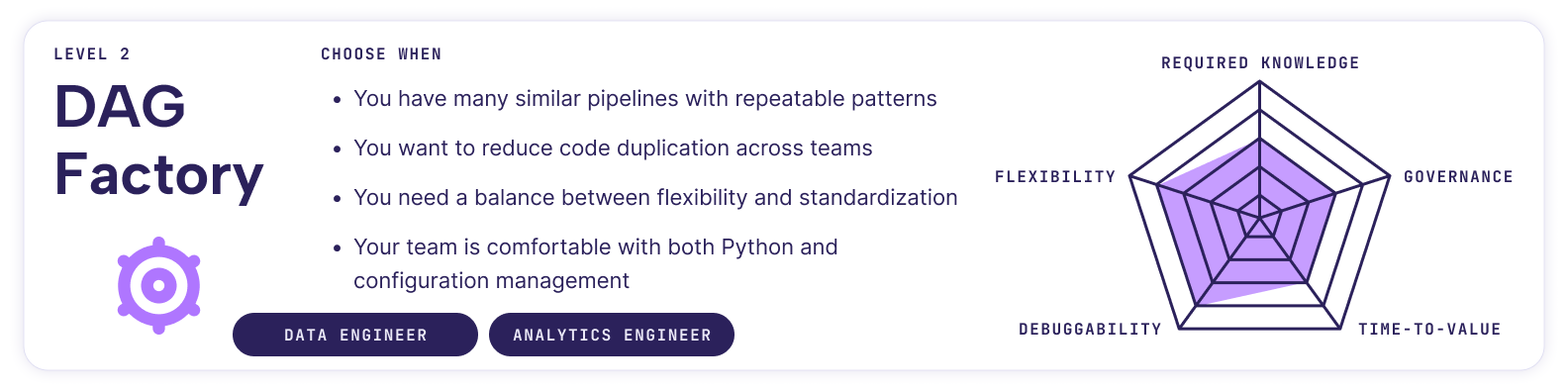 This declarative approach lets you describe what you want to achieve without specifying how. It still requires Airflow knowledge but separates pipeline logic from structure, standardizes repetitive patterns, and empowers a broader range of users.