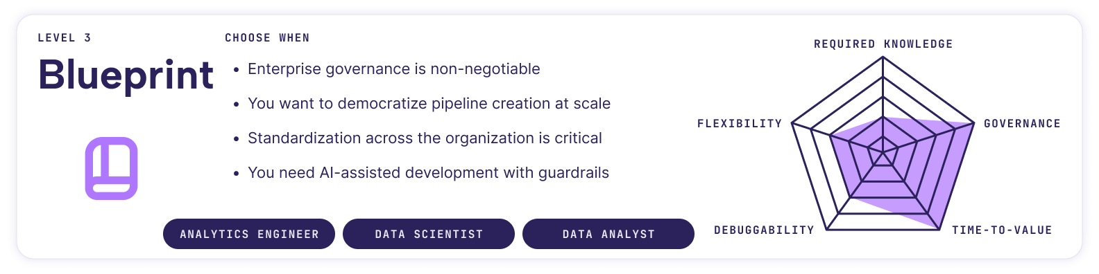 - Prioritize governance early: Higher abstraction levels make it easier to enforce standards, as it enables teams to roll out standardized data pipeline templates, but only if those standards are defined upfront. Blueprint-style approaches excel here, but require organizational maturity.