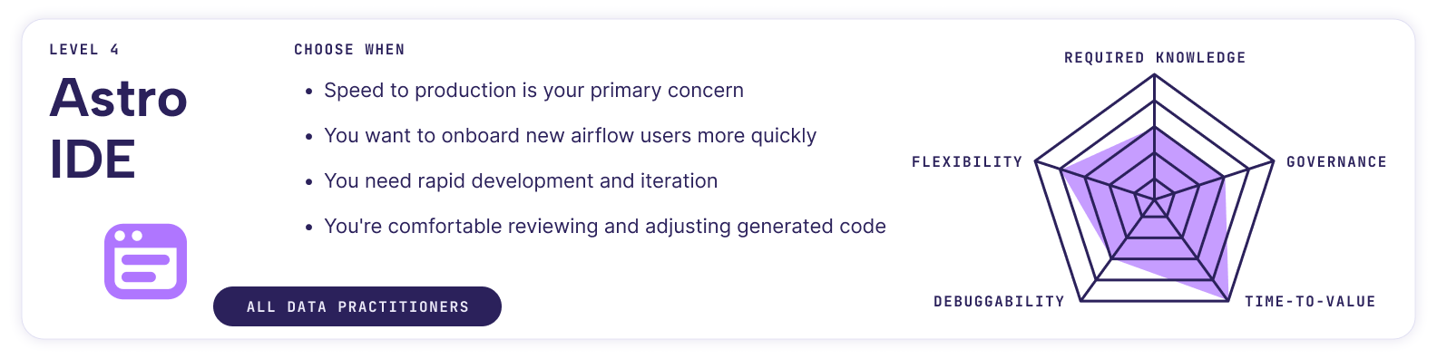 | Attribute | Python (Level 1) | DAG Factory (Level 2) | Blueprint (Level 3) | Astro IDE (Level 4) |