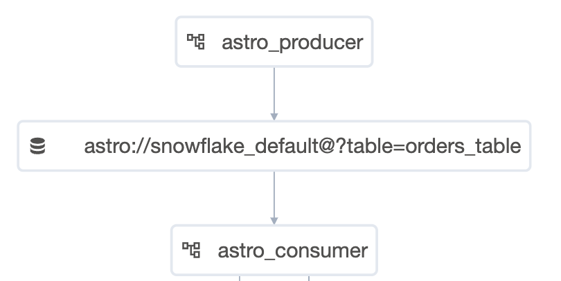 Figure 2: Airflow 2.4 depicts data dependencies among DAGs. Here, when the astro_producer DAG finishes creating the orders_table Table object, the completion of this table triggers the astro_consumer DAG.