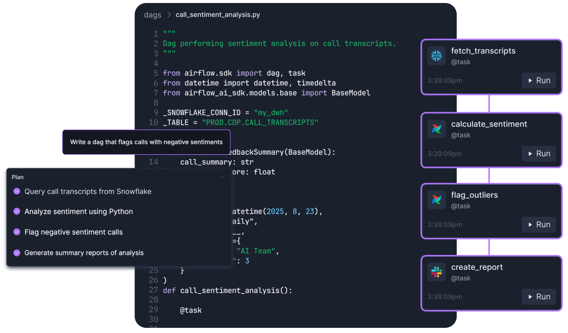 Ship Airflow pipelines in minutes, not days. The only AI-native IDE for data engineers auto-generates, tests, and debugs DAGs using context from your code, configs, and observability metadata.