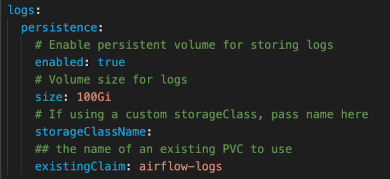 kubectl apply -f pvc.yaml - Change values.yaml under the section logs like this: