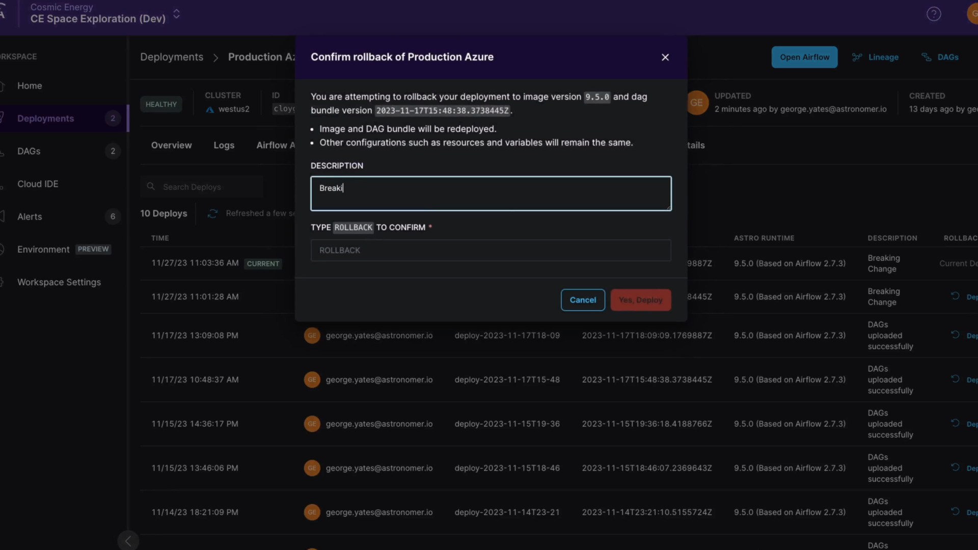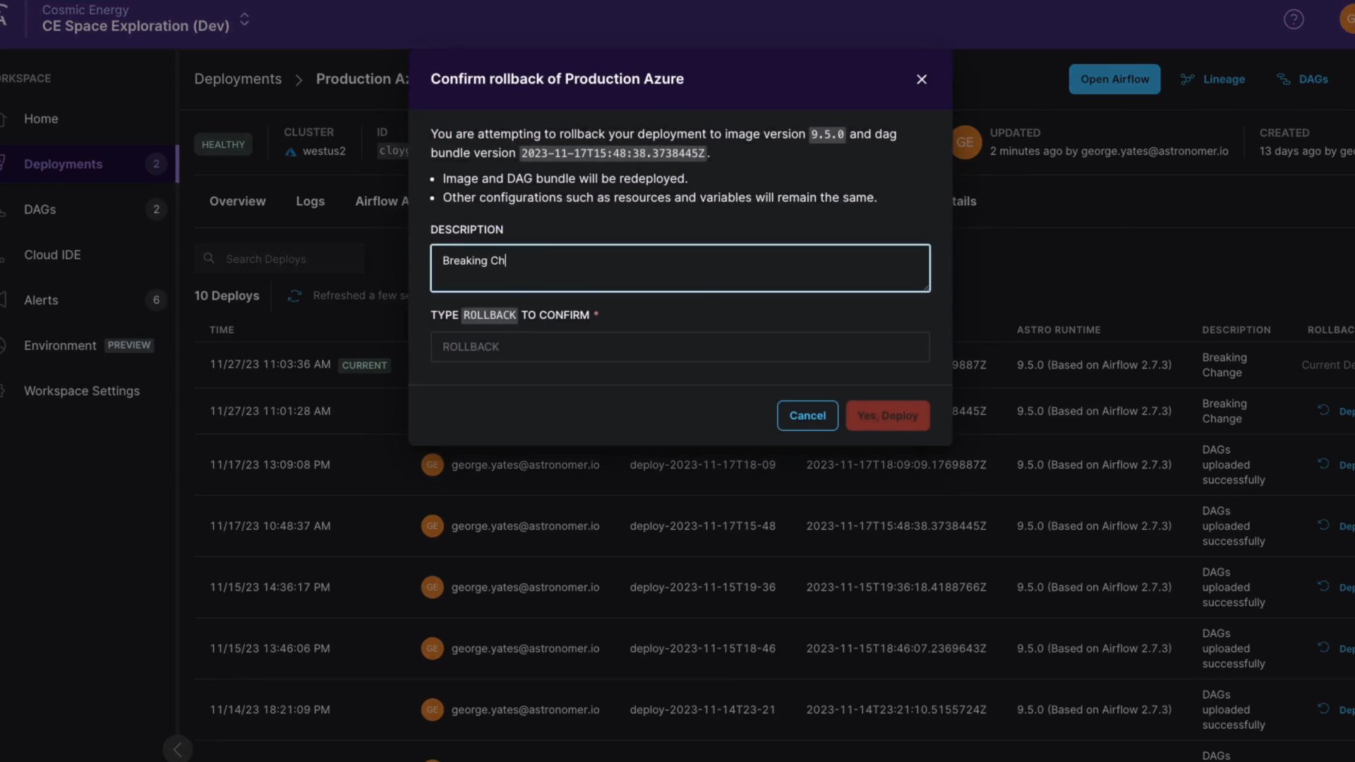 See how deployment rollbacks enable you to upgrade to the latest version of Airflow with confidence, ensuring an easy transition with minimal disruptions or downtime.