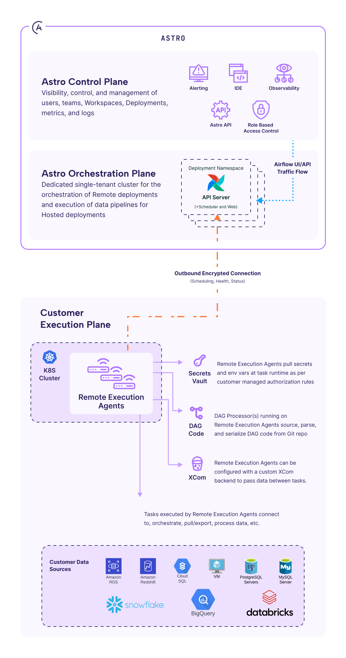 Only outbound encrypted connections are used. There is no need for inbound firewall exceptions. Remote Execution Agents pull work, run it locally under customer-managed identities, and report status back to Astro, aligning with zero-trust principles.